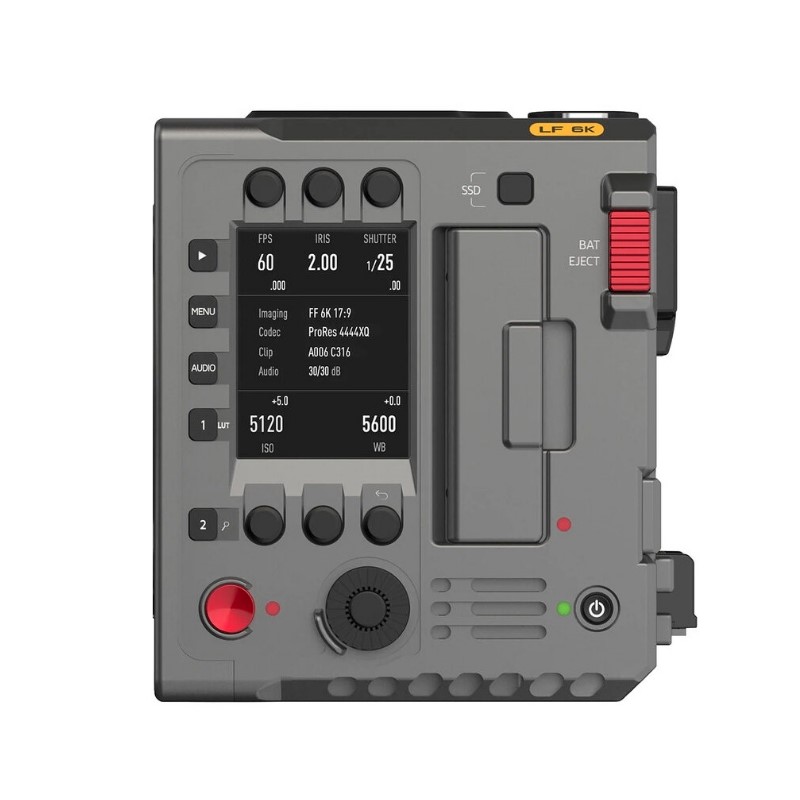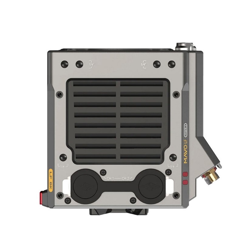 Многоцелевая компактная кинокамера для профессионального кино и видеопроизводства Kinefinity MAVO mark2 LF оснащена полнокадровой CMOS матрицей 36x24 мм 6016x3984 3:2 и отличается гибкой системой смены байонета, которая с помощью специального быстросъемного адаптера обеспечивает возможность использования объективов с креплениями Arri PL и собственного крепления Kinefinity. Съемка материала доступна в форматах ProRes4444XQ, ProRes4444, ProRes422HQ до 12 бит с максимальным разрешением 6K 6016x3984 48 fps, а максимальный показатель частоты кадров в секунду составляет 75 fps для 6K 6016x2520, в режиме S35 140 fps для 4K и 290 fps в кроп режиме 1920x800. Для выбора, в зависимости от условий освещения сцены, в камере предусмотрено два базовых значения нативного ISO 800 и 5120, второе значение обеспечивает результат даже при съемке в ночное время с минимальным уровнем шума. Для записи материала необходимо использовать SSD диск. На корпусе камеры присутствуют выходы 3G-SDI для передачи сигнала на монитор или рекордер. Гибридная пластина питания допускает возможность установки аккумуляторов типа Sony BP-U или V-Mount.