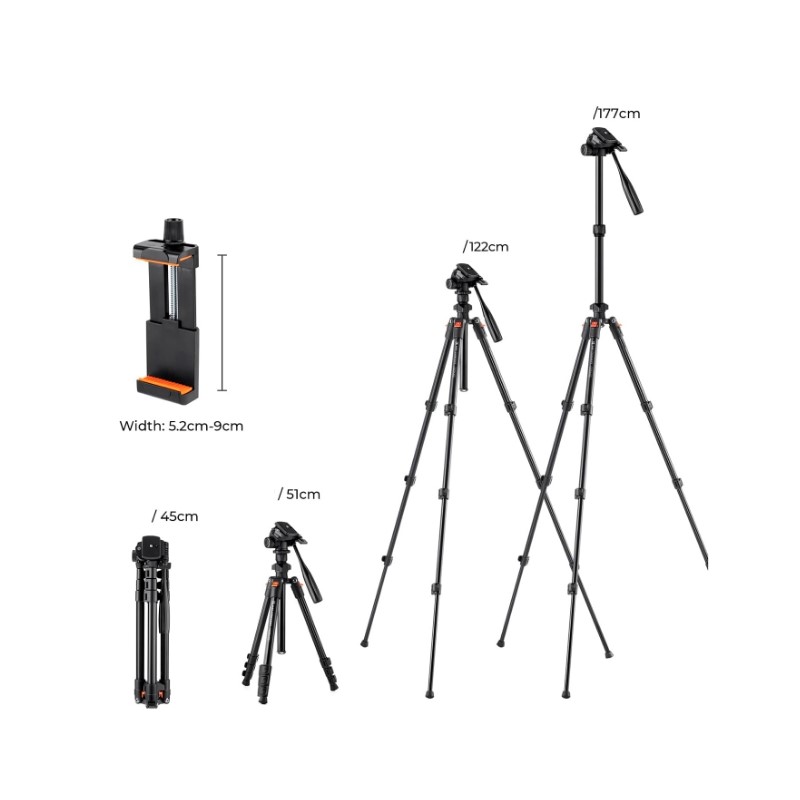 Штатив K&F Concept O234A0 с 2D головой и зажимом для смартфона - легкий и достаточно компактный штатив для фотоаппаратов, видеокамер, смартфонов и другого оборудования. Длина в сложенном виде составляет всего 45 см – штатив помещается в большинство фоторюкзаков (или может быть закреплен снаружи).